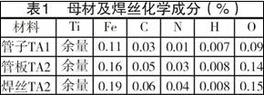 根据钛的焊接性和管子管板接头的特点,试验采用填丝手工钨极氩弧焊。试验材料如下,母材及焊丝化学成分见表1。