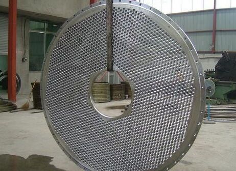 (2)折流板与管板组装 先将折流板与管板固在一起进行加工,再将它们拆开。管板进行一次扩孔、倒角,并可证全部管孔的同心度。